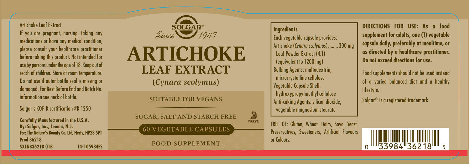 Solgar® Artichoke Leaf Extract 300 mg Vegetable Capsules. A globe artichokes is a perennial plant native to the Mediterranean. Artichoke leaf extract is made from the plant's large green leaves, which contain the highest concentration of cynarin.
