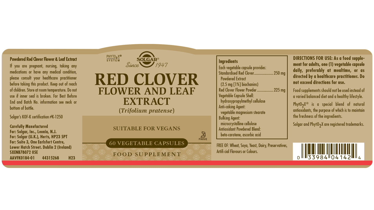 Solgar® Red Clover Flower and Leaf Extract is to be taken as 1 vegetable capsule daily to provide you with this isoflavone rich phytonutrient. A special powdered blend of beta-carotene and ascorbic acid (PhytO2X®) has been added to this formula to maintain the freshness of the ingredients.