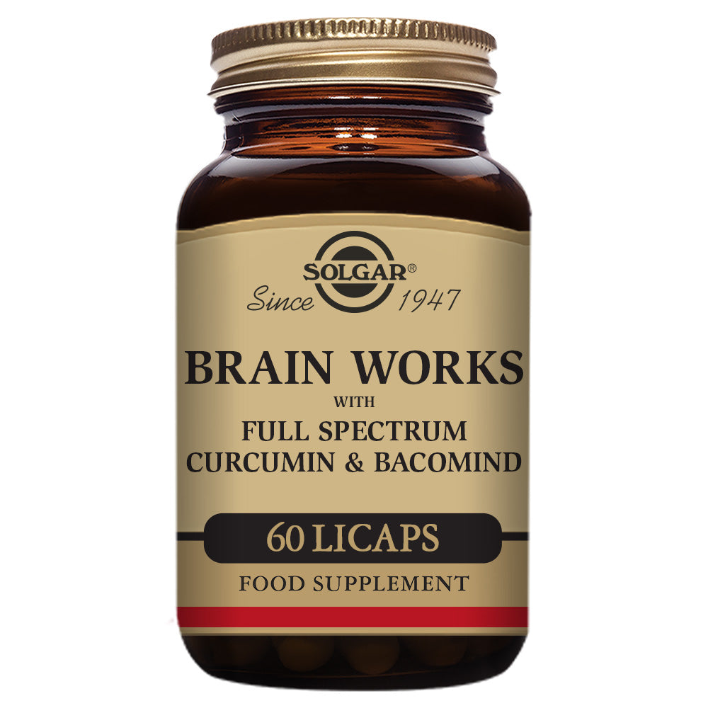 Solgar Brain Works with Full Spectrum Curcumin & BacoMind is a vegan cognitive health formula designed to support focus, memory, and mental clarity across life stages. It combines traditional botanicals with scientifically studied ingredients to assist daily cognitive performance.