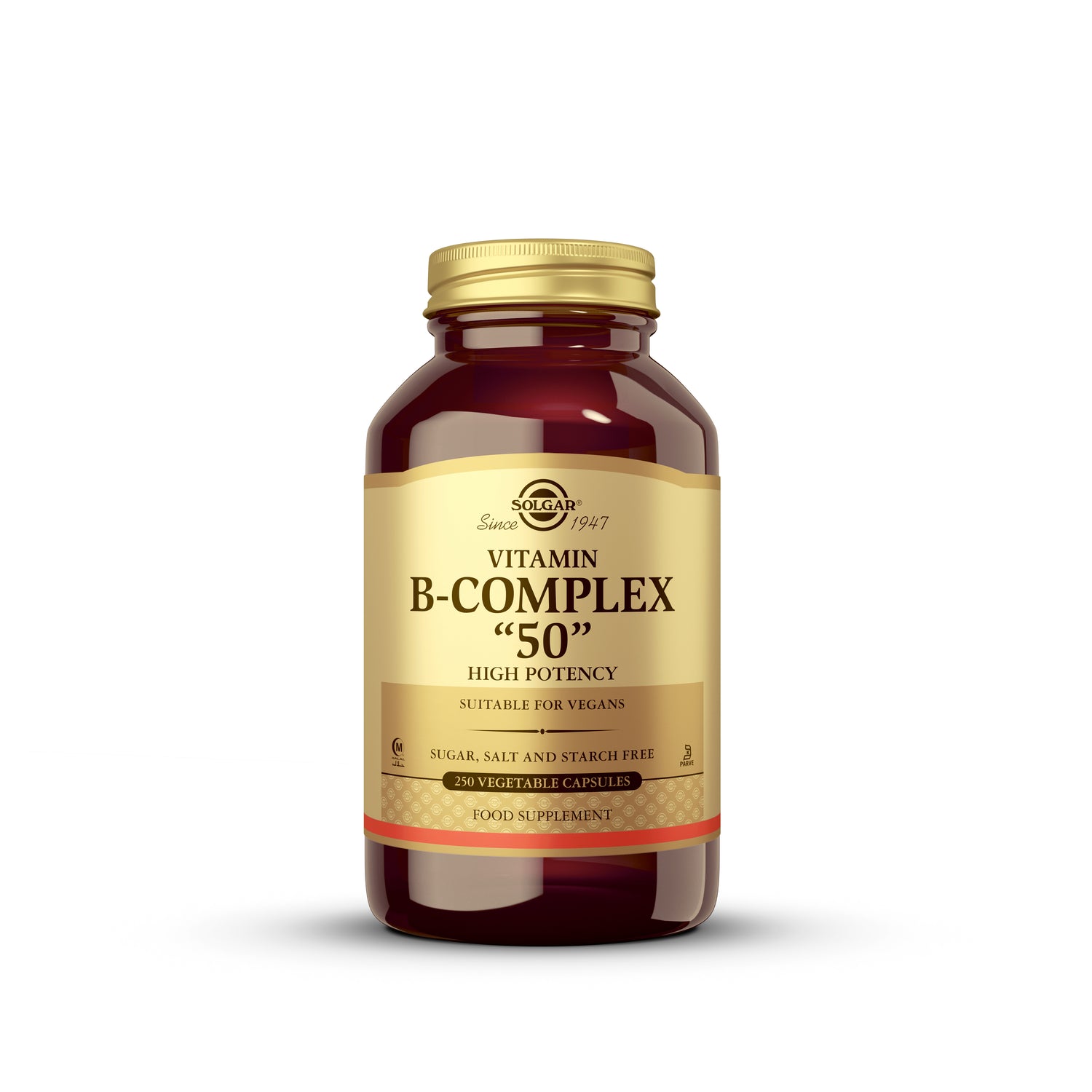 Solgar® Vitamin B-Complex ''50'' is a high potency Vitamin B-Complex delivering a 50 mg dose of key B vitamins. Many B vitamins are interdependent, and thus it is best to take them in combination, such as through a B-complex or a multiple vitamin containing a B-complex. Solgar’s unique formula delivers Thiamine (B1), Riboflavin (B2), Niacin (B3), Pantothenic Acid (B5), and Vitamin B6, along with other B vitamins such as Folic Acid, Biotin (B7) and Vitamin B12. B vitamins are essential nutrients required by the body. They help our bodies convert food into energy, allowing us to stay energised throughout the day, as well as supporting our mental performance. Although not dependent on dietary fat for absorption, as one of the main properties of B vitamins is to convert food into energy, it is recommended to take them with a meal. Solgar® Vitamin B-Complex ''50'' is a rich complex of B vitamin in one capsule daily: • High potency dose of B vitamins • Riboflavin (Vitamin B2), Niacin (Vitamin B3), Vitamin B6 and B12 contribute to the reduction of tiredness and fatigue and energy-yielding metabolism • Pantothenic Acid (Vitamin B5) contributes to normal mental performance • Thiamine (Vitamin B1), Biotin (Vitamin B7), Niacin (B3) and Vitamin B6 contribute to normal nervous system and psychological functions • Thiamine (B1) contributes to the normal function of the heart • Riboflavin (B2) contributes to the protection of cells from oxidative stress and the maintenance of normal vision • Niacin (B3) and Biotin (B7) contribute to the maintenance of normal skin • Biotin (B7) contributes to normal macronutrient metabolism All Solgar® products meet our industry recognized “Gold Standard” for excellence. Made using naturally sourced ingredients and innovating since 1947, Solgar® is your perfect supplement to good health – 98% of Solgar® consumers recommend the brand*