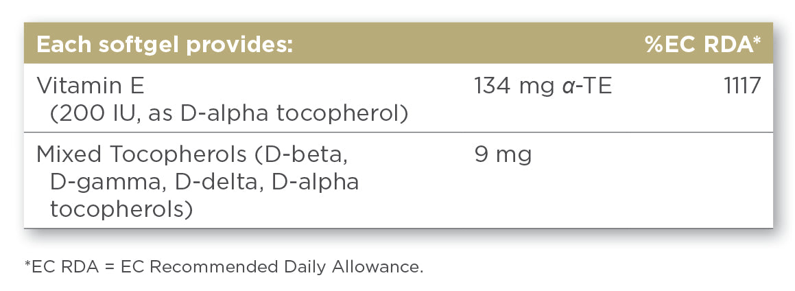 Solgar® Natural Source Vitamin E 134 mg (200 IU), comes in softgel form to support the absorption of this fat-soluble nutrient. This ensures your body gets the support it needs to protect the cells from oxidative stress caused by free radicals. Free radicals are unstable molecules that can damage the cells in your body and are associated with premature aging. It also contains natural Vitamin E (d-alpha tocopherol) which in studies has shown to be 1.3 times more bioavailable than synthetic forms**.
