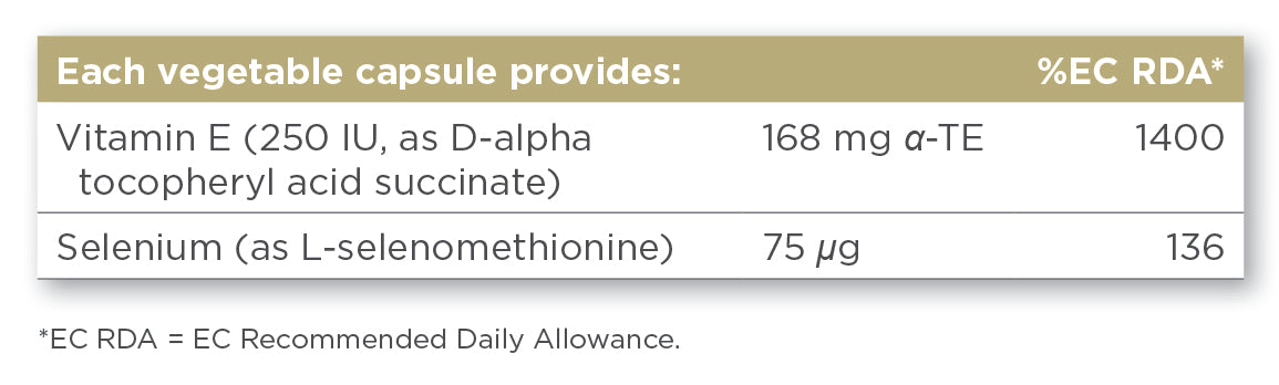 Solgar® Vitamin E with Yeast-Free Selenium comes in vegetable capsule form to support the absorption of this fat-soluble nutrient. This ensures your body gets the support it needs to protect the cells from oxidative stress caused by free radicals. Free radicals are unstable molecules that can damage the cells in your body and are associated with premature aging.