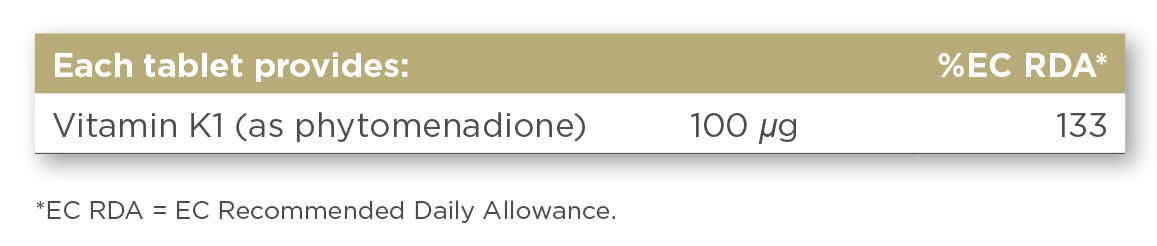 Solgar Vitamin K1 (Phytomenadione) 100 µg Tablets contains Vitamin K, a fat-soluble vitamin. There are 3 types of Vitamin K; K1 (Phytomenadione) is derived from food, K2 (Menaquinone) is produced by intestinal bacteria and K3 (Menadione) is a synthetic form. Vitamin K is important for blood clotting or coagulation and is essential for the synthesis by the liver of blood clotting proteins.